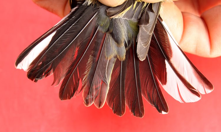 Adult Male ChaffinchAfter ringing many thousands of Chaffinch over several years we find that ageing them is reasonably easy by a combination of general features, tail shape and the colour of tertial feathers. A glance at the tertial feathers will show whether they are markedly edged bright chestnut in an adult or display more diffuse and paler, even straw or yellowish edges in a younger bird. Females are less obvious than the male shown below, with a duller chestnut colour but the principle still applies. In the picture below the male Chaffinch has both types of tertials and in the second picture below, the tail of a young bird of this year shows how juvenile feathers can wear by September.
